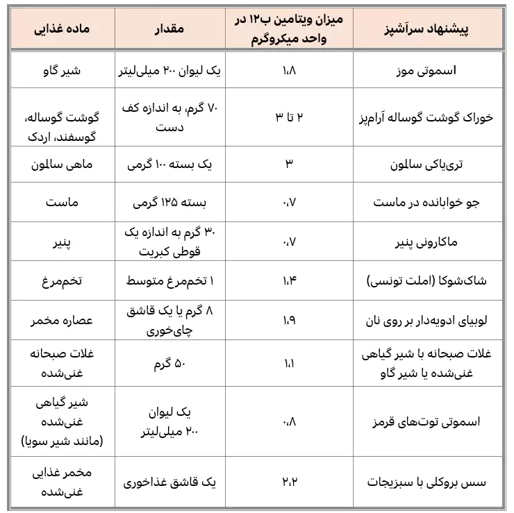 جدول میزان ویتامین ب۱۲ در مواد غذایی