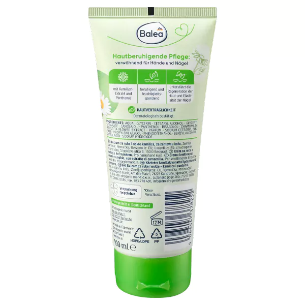 استفاده از انواع مدل کرم دست خارجی برای بسیاری از مشتریان دارای اهمیت است و مرطوب نگه داشت دست ها و همچنین ناخن می تواند تاثیرات بسیار خوبی بر سلامت پوست بگذارد.کرم مرطوب کننده دست و ناخن بابونه باله آ حاوی عصاره گیاه بابونه می باشد که خاصیت ضد التهابی و منجر به تسکین لایه بیرونی پوست و محافظت از آن خواهد شد. همچنین این محصول دارای ویژگی ترمیم کنندگی و بازسازی پوست می باشد و با آبرسانی شدید به شکل قابل توجهی منجر به افزایش نرمی و لطافت پوست دست و افزایش استحکام ناخن ها خواهد شد. کرم دست و ناخن باله آ مدل Chamomile به صورت روزانه برای انواع پوست حتی پوست های بسیار خشک و حساس قابل استفاده است و منجر به حفظ رطوبت، تغذیه و افزایش درخشانی پوست دستان در طول شبانه روز می شود. این محصول به سرعت جذب پوست شده و هیچگونه احساس چربی و سنگینی اضافی ایجاد نخواهد کرد. رفع زبری و پوست پوست شدن اطراف ناخن و پوست دستان از دیگر مزایای مهم این محصول به شمار می رود.