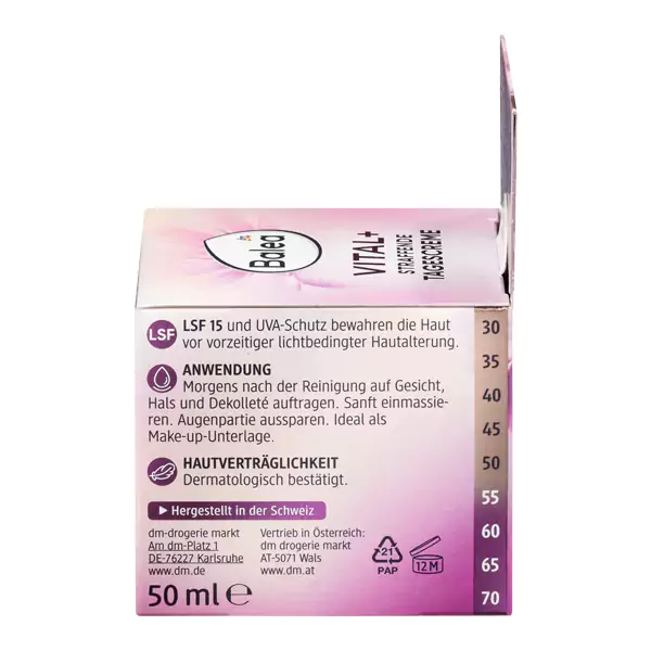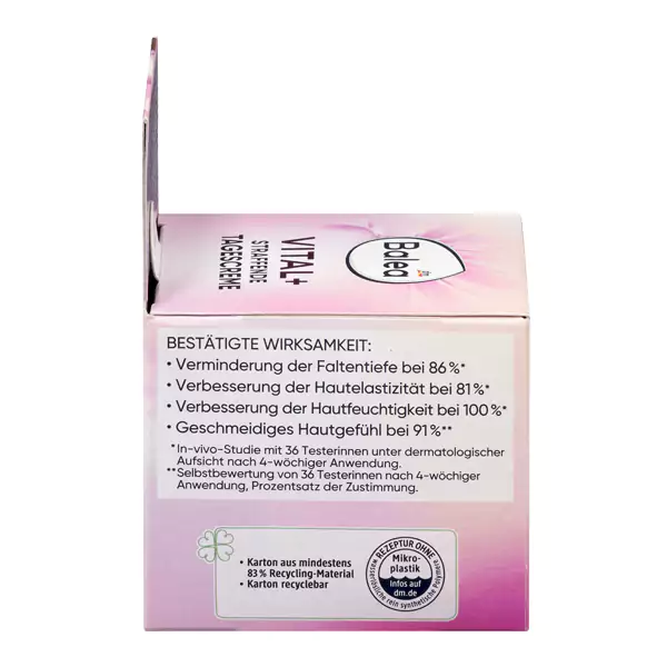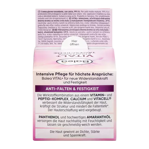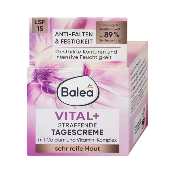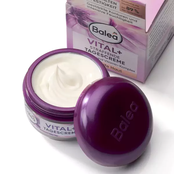 کرم روز سفت کننده Vital+ Balea می تواند با کمک ترکیبی از مواد فعال متشکل از مجموعه ویتامین و پپتید، کلسیم و Vitacell® مقاومت پوست را بهبود بخشد، ساختار پوست را تقویت کرده و عمق چین و چروک را کاهش دهد. پانتنول و روغن مرغوب تاج خروس رطوبتی ماندگار به پوست می دهد و آن را نرم و لطیف می کند. علاوه بر این، می توان از افتادگی پوست جلوگیری کرد و پوست تراکم، استحکام و خاصیت ارتجاعی به دست آورد. طبق آزمایشات و شواهد خریداران این محصول تنها در یک ماه استفاده مداوم به طور چشمگیری قالب صورت بهبود می یابد، پوست صاف و لیفت خواهد شد و گونه ها، نواحی گلو و گردن دوباره به حالت اولیه باز میگردد.کرم روز ضد چروک قوی باله آ ساخت کشور آلمان بوده حجم آن 50 میلی لیتر می باشد