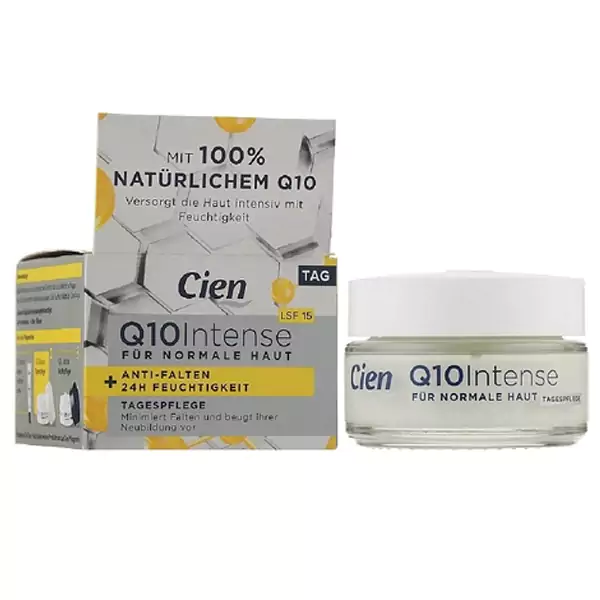 کرم روز ضد چروک و مرطوب کننده Cien مدل Q10 Intense حاوی ترکیبات ضد چروک و آنتی اکسیدان ها نظیر کوآنریم کیوتن، ویتامین E، کافئین و عصاره جلبک کلرلا بوده که پوست را مرطوب می کند و با داشتن SPF در طول روز از آن در برابر خورشید محافظت خواهد کرد.