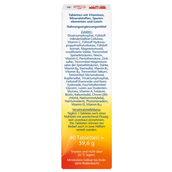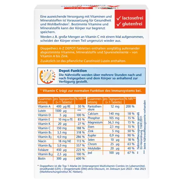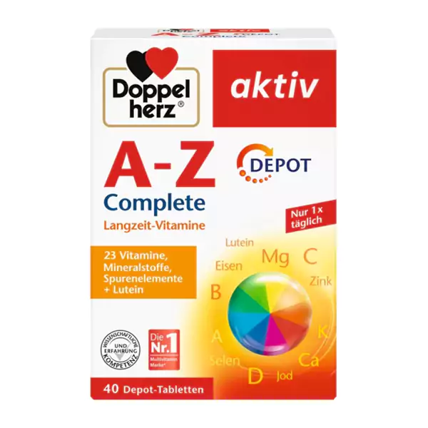 چه ترکیباتی در Doppelherz AZ DEPOT Complete وجود دارد؟ این مکمل غذایی حاوی ویتامینها، مواد معدنی، عناصر کمیاب و کاروتنوئید گیاهی لوتئین است.