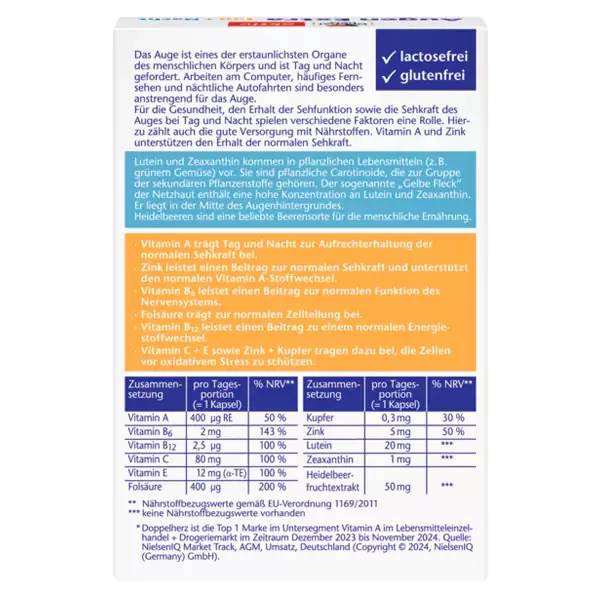 کپسولهای Doppelherz حاوی ویتامینهای A، C و E، ویتامینهای ارزشمند B و عناصر کمیاب روی و مس هستند. آنها همچنین حاوی 20 میلیگرم لوتئین، 1000 میکروگرم زاکسانتین و عصاره بلوبری هستند.لوتئین و زآگزانتین در غذاهای گیاهی (مثلاً سبزیجات سبز) یافت میشوند. آنها کاروتنوئیدهای گیاهی هستند که به گروه مواد گیاهی ثانویه تعلق دارند. به اصطلاح “لکه زرد” (ماکولا) شبکیه حاوی غلظت بالایی از لوتئین و زآگزانتین است. این ماده در مرکز پشت چشم قرار دارد.رنگ زرد به وجود این دو کاروتنوئید نسبت داده میشود. تجمع این مواد گیاهی دقیقاً در جایی رخ میدهد که به محافظت آنتیاکسیدانی بالا نیاز است. به خصوص در ماکولا، نور خورشید تقریباً بدون وقفه نفوذ میکند.