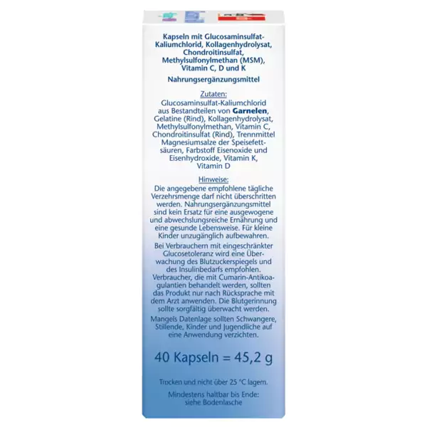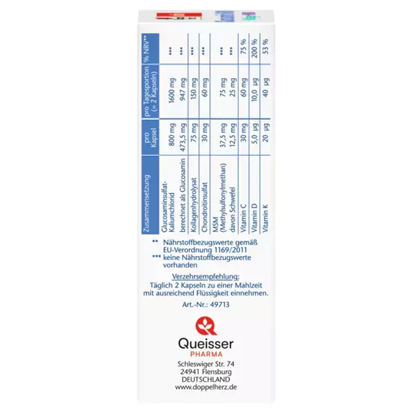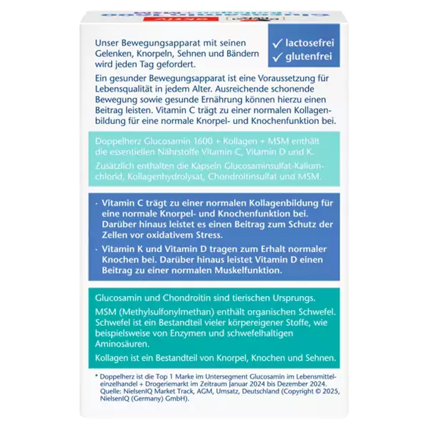 ضروری ترین کارهایی که انجام دادن آن برای بدن انسان بسیار مفید می باشد، ورزش و تغذیه مناسب است که برای سلامت مفاصل ضروری است.سیستم اسکلتی عضلانی ما، با مفاصل، غضروف، تاندونها و رباط هایش، هر روز در معرض چالش است.سیستم اسکلتی عضلانی سالم، پیشنیاز کیفیت زندگی در هر سنی است. علاوه بر فعالیت بدنی ملایم، تأمین خوب مواد مغذی از طریق غذا و استفاده از انواع ویتامین و مکمل خارجی برای سیستم اسکلتی عضلانی و بهره بردن از مکمل غضروف ساز نیز مهم است.کپسول گلوکزامین 1600 با کلاژن و MSM و ویتامین C دوپل هرز آلمان 40 عددی حاوی ۱۶۰۰ میلیگرم گلوکوزامین سولفات پتاسیم کلرید به عنوان دوز روزانه و هنگام مصرف ۲ کپسول در روز و در ترکیب با ۱۵۰ میلیگرم کلاژن هیدرولیزات، ۷۵ میلیگرم MSM (متیل سولفونیل متان) و ۶۰ میلیگرم کندرویتین سولفات است.برای حفظ خاصیت ارتجاعی و کشسانی، مواد مغذی مانند ویتامینهای C و K مورد نیاز است. این مواد مغذی از طریق مایع سینوویال (مایع مفصلی) به غضروف میرسند اما فقط از طریق بارگیری و تخلیه بار مفصل.