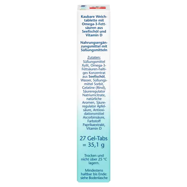شیرین کننده زایلیتول، کنسانتره حاوی اسیدهای چرب امگا 3 از روغن ماهی دریا، آب، شیرین کننده سوربیتول، ژلاتین (گوشت گاو)، تنظیم کننده اسیدیته سیترات سدیم، طعم دهنده های طبیعی، تنظیم کننده اسیدیته اسید مالیک، آنتی اکسیدان اسید اسکوربیک، عصاره پاپریکا رنگی، ویتامین