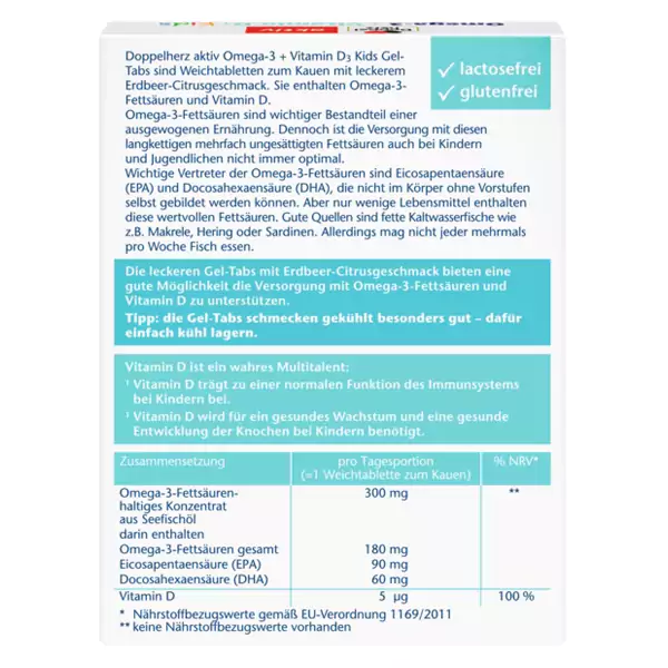 دوپل هرز اکتیو امگا 3 + ویتامین دی 3 قرص نرم برای جویدن با طعم توت فرنگی-مرکباتی خوشمزه است. آنها حاوی اسیدهای چرب ضروری امگا 3 و ویتامین D هستند.