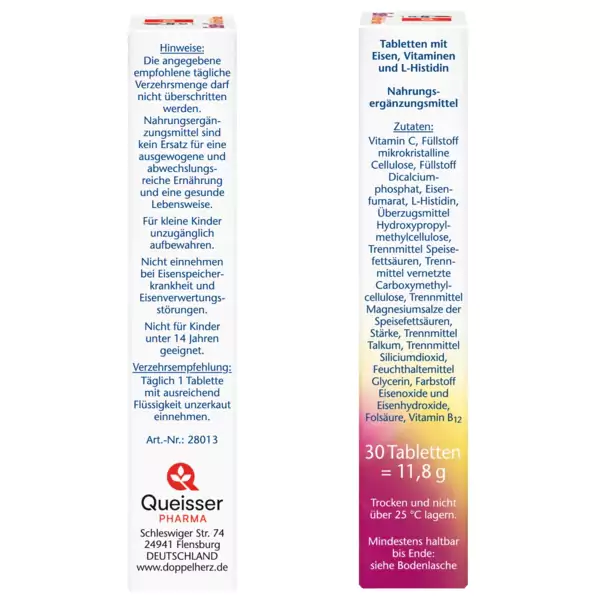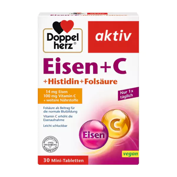 علاوه بر 14 میلی گرم آهن، مینی قرص های آسان بلعیده شده Doppelherz حاوی ویتامین C، اسید آمینه هیستیدین و ویتامین های B اسید فولیک و B12 است.