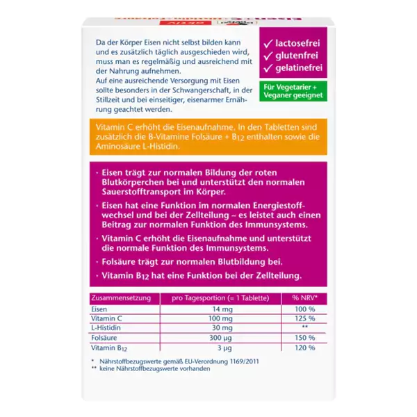 مینی قرص های Doppelherz Iron + C + Histidine + Folic Acid فاقد لاکتوز، گلوتن و بدون ژلاتین بوده و برای گیاهخواران و وگان ها مناسب است.