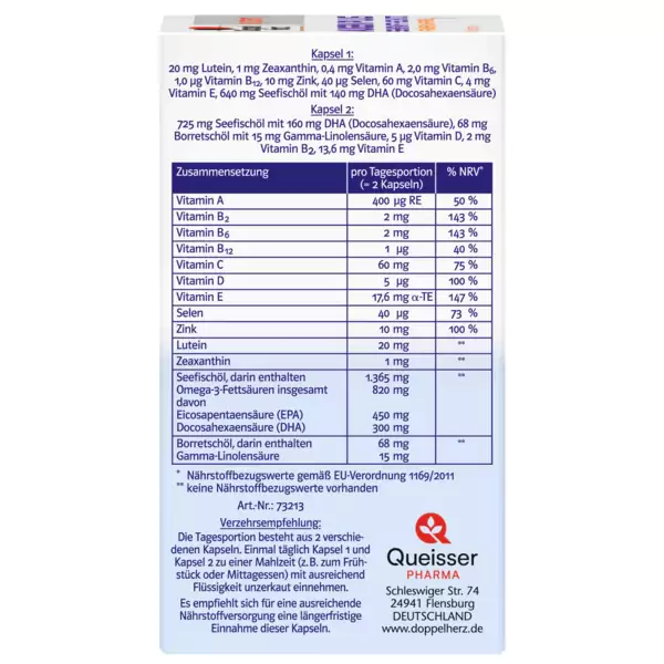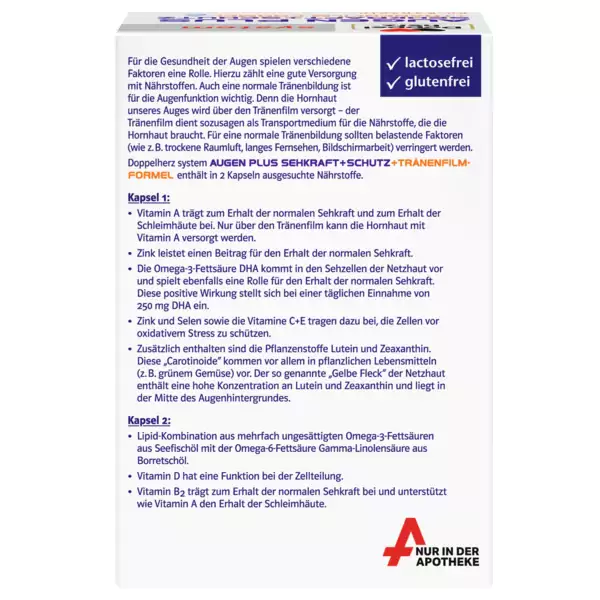 - کپسول 1 حاوی ویتامین های A، C، E، B12 و B6، اسید چرب امگا 3 DHA و عناصر کمیاب سلنیوم و روی و همچنین حاوی مواد گیاهی لوتئین و زآگزانتین هستند.