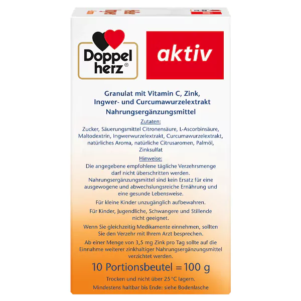 گرانول های مکمل غذایی حاوی ویتامین C، روی، زنجبیل و عصاره ریشه زردچوبه، شکر، اسید سیتریک اسیدی کننده، اسید ال اسکوربیک، مالتودکسترین، عصاره ریشه زنجبیل، عصاره ریشه زردچوبه، طعم طبیعی، طعم دهنده های طبیعی مرکبات، روغن نخل، سولفات روی. لطفا به اطلاعات مربوط به آلرژن ها توجه کنید.