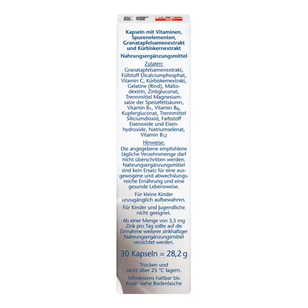 عصاره انار، دی کلسیم فسفات حجیم کننده، ویتامین C، عصاره دانه کدو تنبل، ژلاتین (گوشت گاو)، مالتودکسترین، گلوکونات روی، نمکهای منیزیم اسیدهای چرب، دی اکسید سیلیکون ضد کلوخه شدن، ویتامین B1، ویتامین B6، گلوکونات مس، اکسیدهای آهن رنگی و هیدروکسیدهای آهن، سلنیت سدیم، ویتامین B12