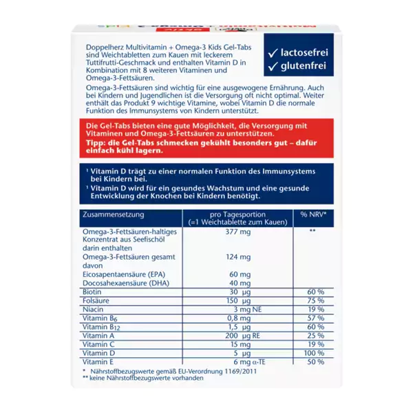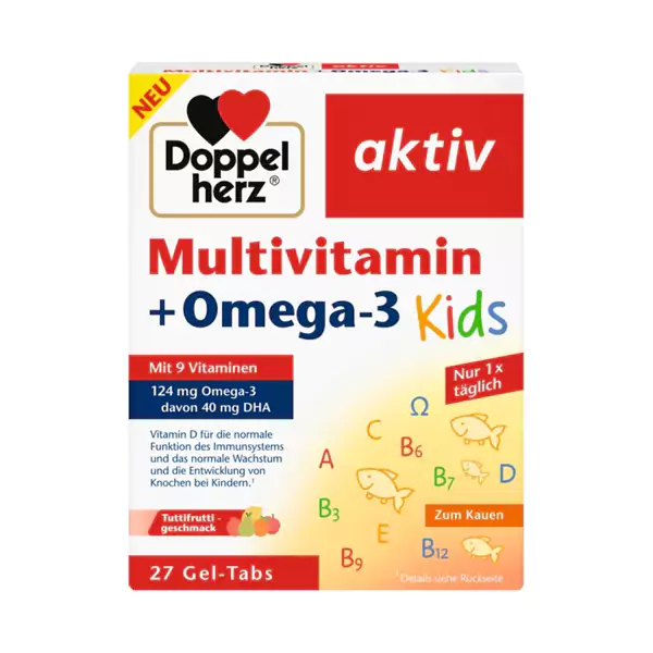 استفاده از انواع نمونه ویتامین و مکمل خارجی همان طور که در بزرگسالان مورد نیاز واقع می شود برای بسیاری از کودکان نیز می توان برخی از نمونه ها و مدل ها را خرید و استفاده نمود.برند بسیار معتبر و جهانی داپل هرز آلمان اکنون یک لاین تخصصی از انواع مکمل کودکان ارائه می دهد که بسیار کارآمد و به روز می باشد.مکمل مولتی ویتامین + امگا 3 کودک دوپل هرز آلمان (Doppelherz) علاوه بر دو اسید چرب امگا ۳ ضروری DHA و EPA، حاوی ۹ ویتامین هستند: بیوتین، اسید فولیک، نیاسین، ویتامین B6، ویتامین B12، ویتامین A، ویتامین C، ویتامین D و ویتامین E.این مکمل غذایی میتواند به کودکان و بزرگسالانی که در مصرف قرص یا کپسول مشکل دارند، کمک کند تا از دریافت مواد مغذی استفاده نمایند، سادهترین راه برای تأمین نیازهای امگا ۳ شما، مصرف منظم ماهیهای دریایی چرب (مانند ماهی سالمون، ماهی خال مخالی، ماهی تن، ساردین) است.این گونههای ماهی به ویژه غنی از EPA و DHA هستند و بهترین منبع طبیعی این اسیدهای چرب با زنجیره بلند ارزشمند محسوب میشوند. بنابراین، دو وعده غذایی ماهی در هفته توصیه میشود.به ویژه کودکان، و همچنین بسیاری از بزرگسالان، قادر به دستیابی به این مقدار و تأمین نیازهای امگا ۳ خود از طریق رژیم غذایی به تنهایی نیستند. در چنین مواردی، مکملهای غذایی میتوانند به راحتی از تأمین کافی پشتیبانی کنند.و آنها همچنین خوشمزه هستند: قرصهای ژلهای مولتیویتامین + امگا ۳ مخصوص کودکان Doppelherz ما با طعم میوهای ترش و شیرین خود، مورد توجه پیر و جوان قرار گرفتهاند.