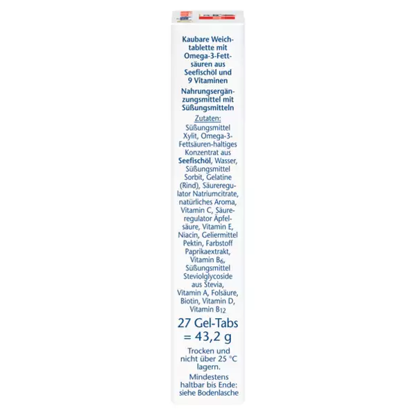 شیرین کننده زایلیتول، کنسانتره حاوی اسید چرب امگا ۳ از روغن ماهی دریایی، آب، شیرین کننده سوربیتول، ژلاتین (گوشت گاو)، تنظیم کننده اسیدیته سدیم سیترات، طعم دهنده طبیعی، ویتامین C، تنظیم کننده اسیدیته اسید مالیک، ویتامین E، نیاسین، عامل ژل کننده پکتین، عصاره رنگ پاپریکا، ویتامین B6، شیرین کننده استویول گلیکوزیدها از استویا، ویتامین A، اسید فولیک، بیوتین، ویتامین D، ویتامین B12