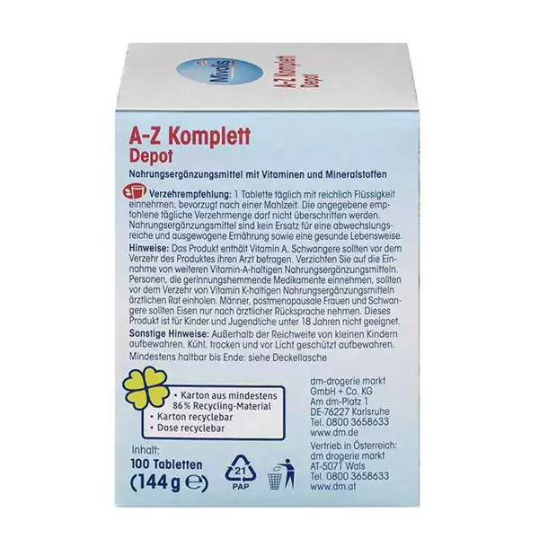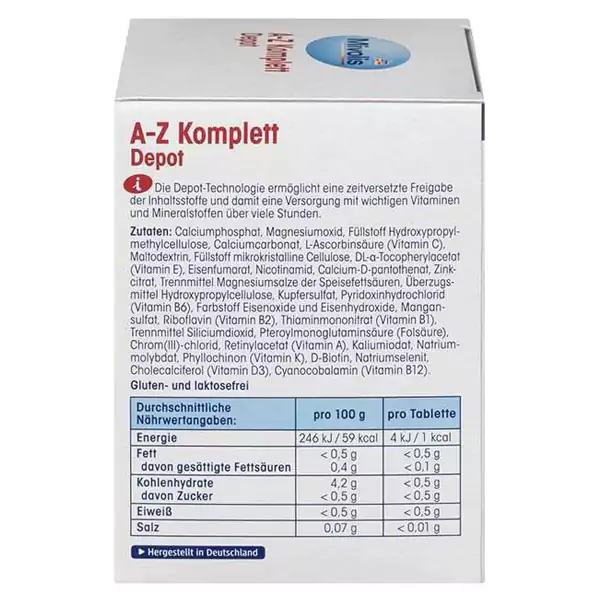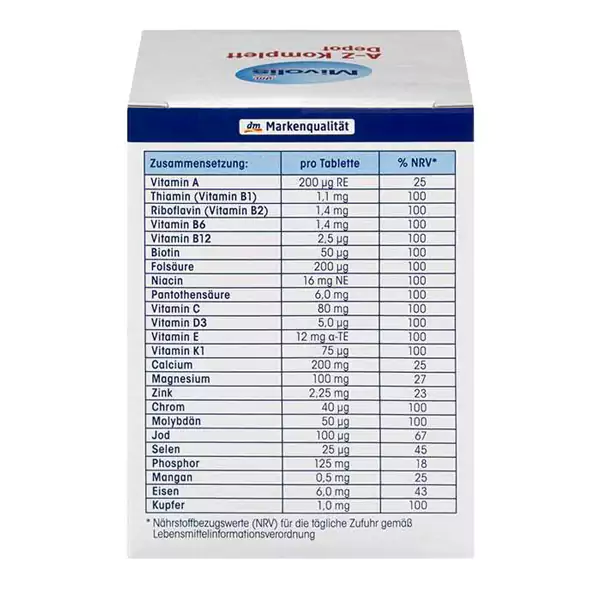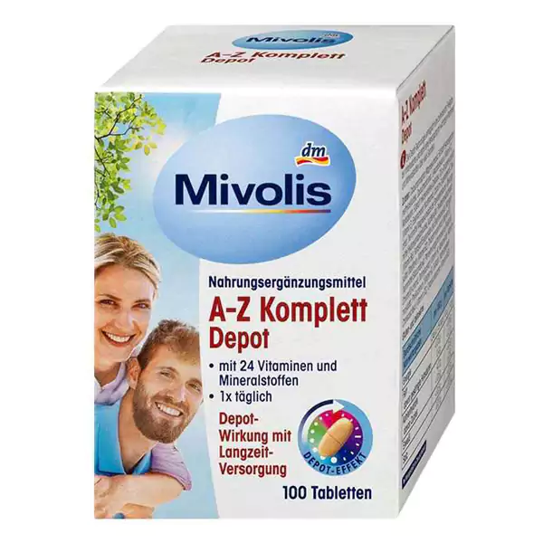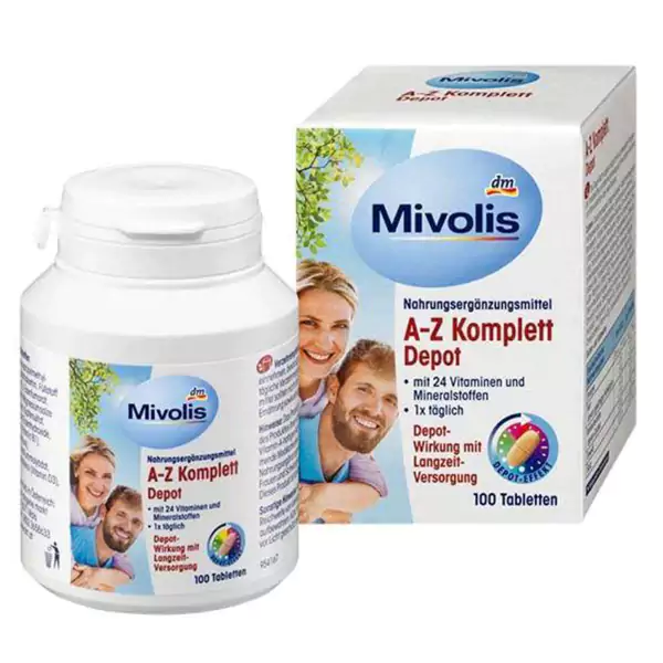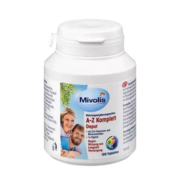 یکی از نمونه های مکمل و ویتامین بسیار ضروری برای بدن را می توان قرص مولتی ویتامین میوولیس A-Z Depot نامید که استفاده از آن می تواند برای بسیاری از افراد خانم و آقا سنین زیر 50 سال مفید می باشد.قرص مولتی ویتامین A-Z کامپلیت Mivolis حاوی تمامی ویتامین ها و مواد موردنیاز بدن در طول روز است و با تامین آن ها به شکل Depot می تواند در طول روز به سلامت عمومی بدن کمک بسزایی کند. قرص مولتی ویتامین میولیس یکی از پرفروش ترین مکمل های مولتی ویتامین در دنیا است و با توجه به اینکه افراد معمولا از رژیم غذایی خود تمامی مواد مغذی را دریافت نمی کنند، بسیار مناسب است. این محصول از تعدادی زیادی ویتامین و مواد معدنی تشکیل شده و هر یک از آن ها می تواند به بهبود عملکر مغز، سیستم عصبی، پوست و مو، کاهش و جلوگیری از بیماری ها و سرطان ها، تقویت سیستم ایمنی و حفظ سلامت افراد کمک شایانی کند. بیوتین موجود در قرص مولتی ویتامین کامپلیت Mivolis از ریزش مو جلوگیری خواهد کرد، آهن و فولیک اسید آن از کم خونی جلوگیری نموده و خاصیت خونسازی دارد، ویتامین های C + E + D به عنوان یک آنتی اکسیدان قوی عمل نموده و از بیماری ها جلوگیری خواهد کرد. همچنین در این مولتی ویتامین کروم، سلنیوم، ید، زینک و منیزیم وجود دارد که هر کدام به نحوی به سلامت عمومی بدن و افزایش کیفیت زندگی کمک می کنند. تعداد 100 عددی این محصول باعث شده تا یک مولتی ویتامین مقرون به صرفه نیز به شمار برود و تا مدت ها شما را از خرید مولتی ویتامین دیگری بی نیاز کند.