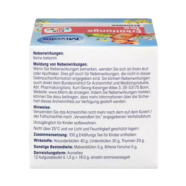 به دلیل اهمیت بسیار بالا در مورد استفاده از انواع مکمل و ویتامین خارجی و یا انواع دم نوش مخصوص کودکان ،اکنون برند میولیس آلمان محصول بسیار فوق العاده ارائه نموده است که می تواند تاثیر بسیار خوب و سریع داشته باشد.چای سرد ضد سرماخوردگی کودکان میوولیس Mivolis دارای 12 عدد کیسه چای به وزن 1.4 گرم با ترکیبات گل سنجد 40 گرم؛ شکوفه های لیندن و 30 گرم؛ آویشن 20 گرم و گل خطمی 5 گرم،رازیانه 5 گرم جهت روند بهبود سرماخوردگی های تب دار که درمان تعریق مورد نظر است بسیار کارآمد می باشد.با توجه به دستوالعمل ذکر شده آن را مورد استفاده قرار دهید و روند درمانی را کامل نمایید،اگر به هر یک از موارد دارویی گیاهی حساسیت دارید استفاده نکنید.