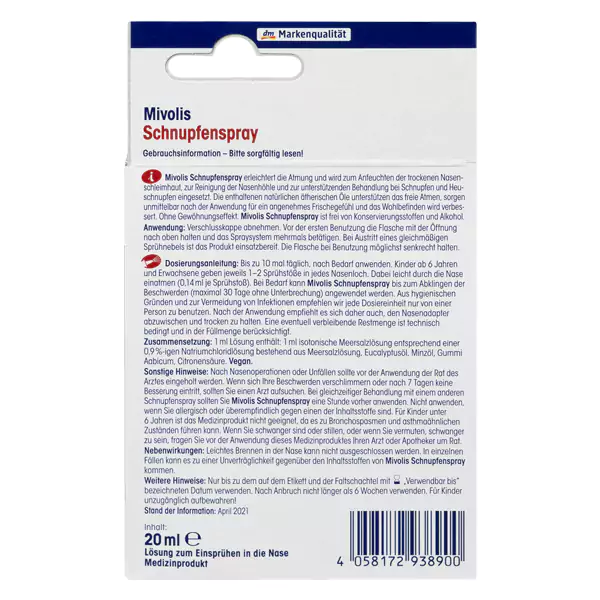 اسپری بینی سرد Mivolis تنفس را آسان می کند و برای مرطوب کردن مخاط خشک بینی، تمیز کردن حفره بینی و حمایت از درمان سرماخوردگی و تب یونجه استفاده می شود. اسانسهای طبیعی موجود در آن از تنفس آزاد پشتیبانی میکنند، بلافاصله پس از استفاده از این مکمل و ویتامین خارجی احساس شادابی میکنید و سلامتی خود را بهبود میبخشید.اسپری بینی سرد میوولیس برای تسکین ملایم سرماخوردگی بدون مواد نگهدارنده با روغن های ضروری و فاقد مواد نگهدارنده و الکل می باشد.