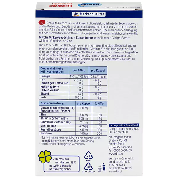 حافظه خوب و تمرکز در هر میان سالی و کهن سالی بسیار مهم است. این ویژگی ها به ویژه در موقعیت های استرس زا و به ویژه با افزایش سن می تواند کاهش یابد. بنابراین تامین کافی مواد مغذی برای متابولیسم مغز و اعصاب بسیار مهم است. مکمل تقویت حافظه و تمرکز جینکو میولیس با اسید پانتوتنیک برای حمایت از عملکرد ذهنی و همچنین روی و ویتامین B به مقدار 100 میلی گرم عصاره جینکو بیلو ، Miovlis Ginkgo Memory + Concentration حاوی ویتامین بسیار موثر در تقویت ذهن و حافظه است. ویتامین های B1 و B12 به متابولیسم طبیعی انرژی و عملکرد طبیعی ذهن کمک می کنند. ویتامین B12 به کاهش خستگی و خستگی کمک می کند، در حالی که اسید پانتوتنیک موجود در آن از عملکرد ذهنی طبیعی پشتیبانی می کند. ویتامین B2 از سیستم عصبی طبیعی پشتیبانی می کند و اسید فولیک در تقسیم سلولی نقش دارد. عنصر کمیاب روی به عملکرد شناختی طبیعی کمک می کند.این قرص تقویت ذهن و حافظه خارجی می تواند اثرگذاری بسیار فوری و بلند مدتی را ایجاد نماید.