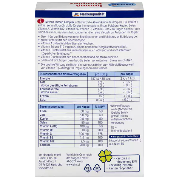 یکی از موارد و نکات بسیار مورد توجه برای خانم ها و آقایان تقویت بنیه دفاعی بدن در برابر امراض مختلف است و به این جهت در تهیه و خرید انواع شربت،قرص جوشان ،ساشه و قرص و موارد تزریقی در این باره اهمیت بالا می دهند.اکنون می توان تنوع بالایی از این گونه محصولات در برند میوولیس آلمان مشاهده نمود که از ترکیبات بسیار غنی و مختلف ویتامین بهره می برند و در نوع مختلف عرضه می شوند.قرص تقویت سیستم دفاعی و ایمنی بدن immun komplex میوولیس حاوی آهن، اسید فولیک، مس، سلنیوم، ویتامین A، ویتامین B12، ویتامین B6، ویتامین C، ویتامین D و روی می باشد که هریک به نوعی از ویتامین های ضروری و مورد نیاز بدن می باشد.حاوی 32 عدد کپسول است و تقریبا برای یک ماه می تواند مورد استفاده قرار بگیرد و البته دوره سه ماهه برای آن می تواند بسیار تاثیر گذار باشد و یا در زمان و فصل خاص می توانید مورد استفاده قرار دهید.برای مثال در فصل زمستان برای بهبود شرایط بدن و تقویت بسیاری از خانم ها محصول را در دوره سه ماهه مورد استفاده قرار می دهند.
