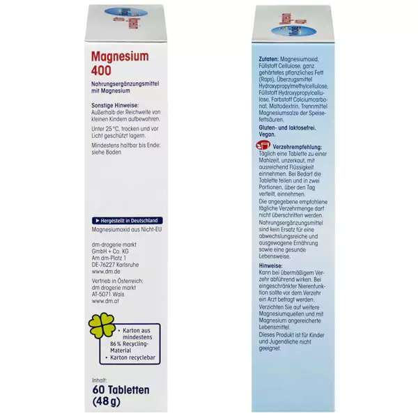 نام دقیق محصول: مکمل غذایی حاوی منیزیم ترکیبات: اکسید منیزیم، سلولز پرکننده، چربی گیاهی کاملا هیدروژنه (کلزا)، پوشش دهنده هیدروکسی پروپیل متیل سلولز، رنگ آمیزی کربنات کلسیم، مالتودکسترین، ماده ضد چسبندگی نمک منیزیم اسیدهای چرب