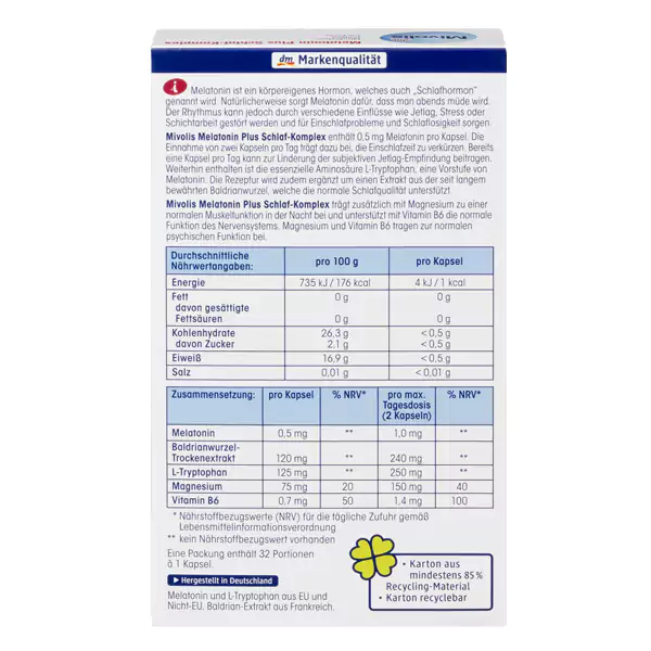 ملاتونین هورمونی است که توسط بدن تولید میشود و به آن «هورمون خواب» نیز میگویند. ملاتونین به طور طبیعی باعث می شود در عصر احساس خستگی کنید. با این حال، این هورمون می تواند تحت تأثیر تأثیرات مختلفی مانند مسافرت های طولانی هوایی، استرس یا شیفت کاری مختل شود و منجر به مشکلات به خواب رفتن و بی خوابی شود. قرص خواب آور ملاتونین پلاس میولیس حاوی 0.5 میلی گرم ملاتونین در هر کپسول است و توسط برند میولیس آلمان ارائه شده است ،مصرف دو کپسول در روز به کوتاه شدن زمان به خواب رفتن کمک می کند. فقط یک کپسول در روز می تواند به کاهش احساس ذهنی کمک کند. همچنین حاوی اسید آمینه ضروری L- تریپتوفان، پیش ساز ملاتونین است. این فرمول همچنین با عصاره ای از ریشه قدیمی سنبل الطیب تکمیل شده است که از کیفیت خواب طبیعی بهره برداری میکند. کپسول خواب Mivolis Melatonin Plus همچنین حاوی منیزیم برای حمایت از عملکرد طبیعی عضلات در شب و ویتامین B6 برای حمایت از عملکرد طبیعی سیستم عصبی است. منیزیم و ویتامین B6 به عملکرد طبیعی ذهن کمک می کنند.ملاتونین به کوتاه شدن زمان به خواب رفتن کمک می کند. سنبل الطیب به کیفیت خواب طبیعی کمک می کند با ال-تریپتوفان، پیش ساز ملاتونین با ویتامین B6 و منیزیم 1 میلی گرم ملاتونین در حداکثر دوز روزانه کمک رسان فوق العاده در به خواب رفتن راحت است.
