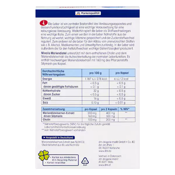 یکی ار دقه دقه های اصلی بسیاری از مردان و زنان سالم بودن کبد و بدون ایراد و اشکال بدون این عضو حیاطی می باشد و از این رو برند میولیس آلمان نمونه بسیار عالی از مکمل و ویتامین ارائه نموده که در پاک سازی کبد موثر می باشد.کبد یکی از اجزای اصلی سیستم گوارش است و عملکرد صحیح آن برای هضم روان ضروری است. علاوه بر این، کبد نقش حیاتی به عنوان یک اندام متابولیک ایفا میکند. اولاً، کبد از مواد مغذی موجود در غذا استفاده میکند، ویتامینهای مهم را ذخیره میکند و متابولیسم قند را تنظیم میکند. ثانیاً، کبد مسئول تجزیه مواد نامطلوب مانند الکل، داروها و سموم محیطی است. کبد همچنین صفرا تولید میکند که برای متابولیسم چربی ضروری است. خار مریم میوولیس، با کولین و عصاره خار مریم خود، از حفظ عملکرد طبیعی کبد پشتیبانی میکند. این گیاه حاوی عصاره خار مریم با کیفیت بالا و ۱۶۰ میلیگرم ماده گیاهی سیلیمارین در هر کپسول است.