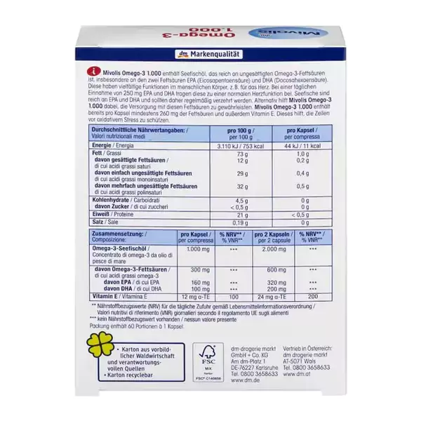 با استفاده از کپسول امگا ۳ میوولیس آلمان، نیازهای بدن شما به امگا ۳ به طور کامل برطرف می شود و هیچ کمبودی از این جهت نخواهید داشت. دریافت میزان کافی از امگا ۳ کمک می کند تا بدن شما سالم تر باشد و در برابر بیماری ها نیز مقاوم شود. در رابطه با فواید امگا ۳ برای بدن تحقیقات و آزمایشات زیادی انجام شده است و نتایج نشان می دهد که این ماده مغذی حتی در پیشگیری از بیماری ها نیز بسیار مؤثر بوده است. یکی از مهم ترین فواید امگا ۳ مربوط به ویتامین E موجود در آن است که یک آنتی اکسیدان و ضدسرطان بسیار قوی محسوب می شود. همچنین این ماده علاوه بر ضدسرطان بودن می تواند از بدن شما در برابر اثر مخرب عوامل طبیعی مثل اشعه فرابنفش خورشید و آلودگی هوا محافظت کند. جالب است که بدانید کمبود این ویتامین حیاتی و مهم برای بدن در کسانی که مشکلات و بیماری های گوارشی دارند یا غذاهای خیلی کم چرب می خورند، بیشتر دیده می شود.